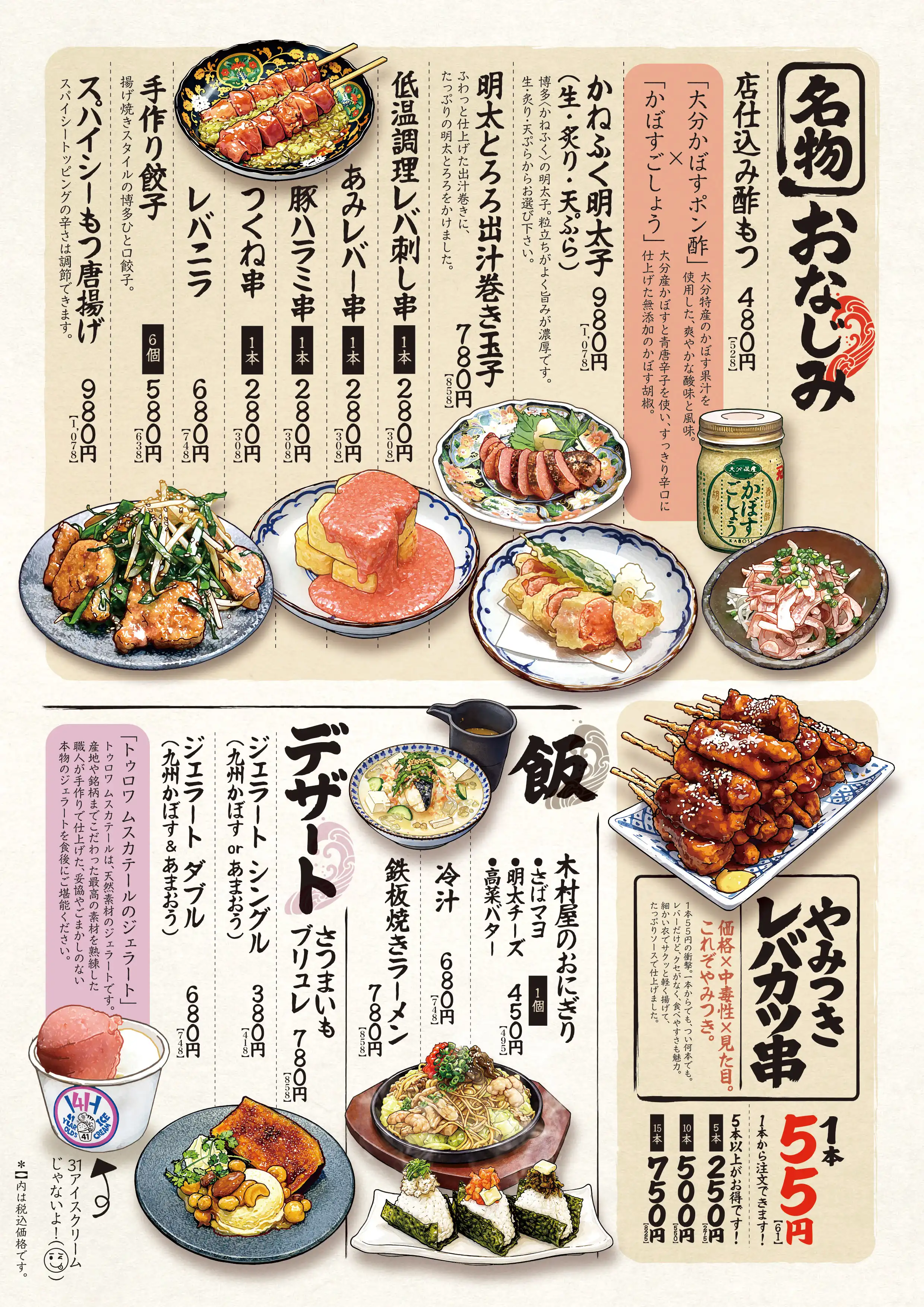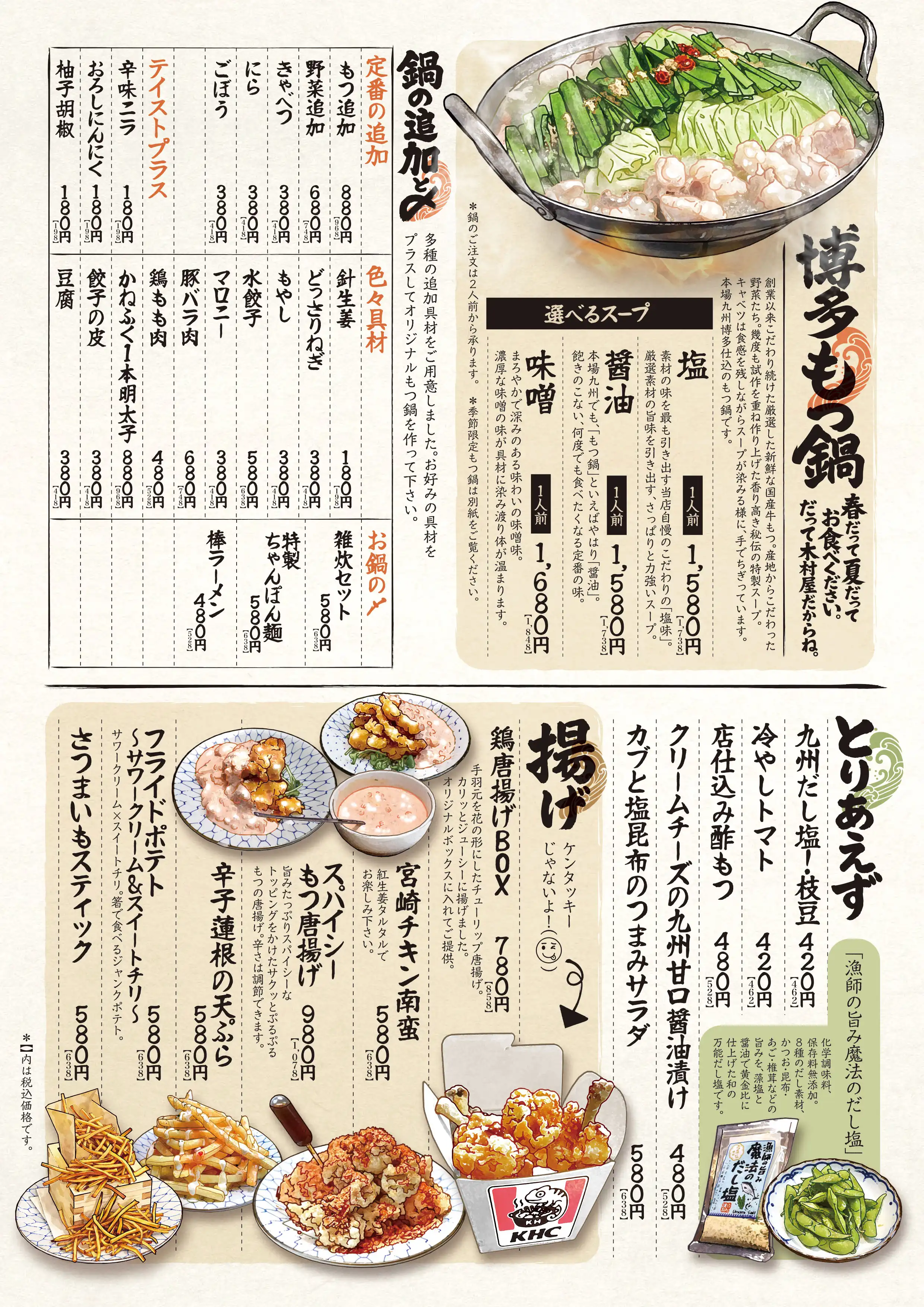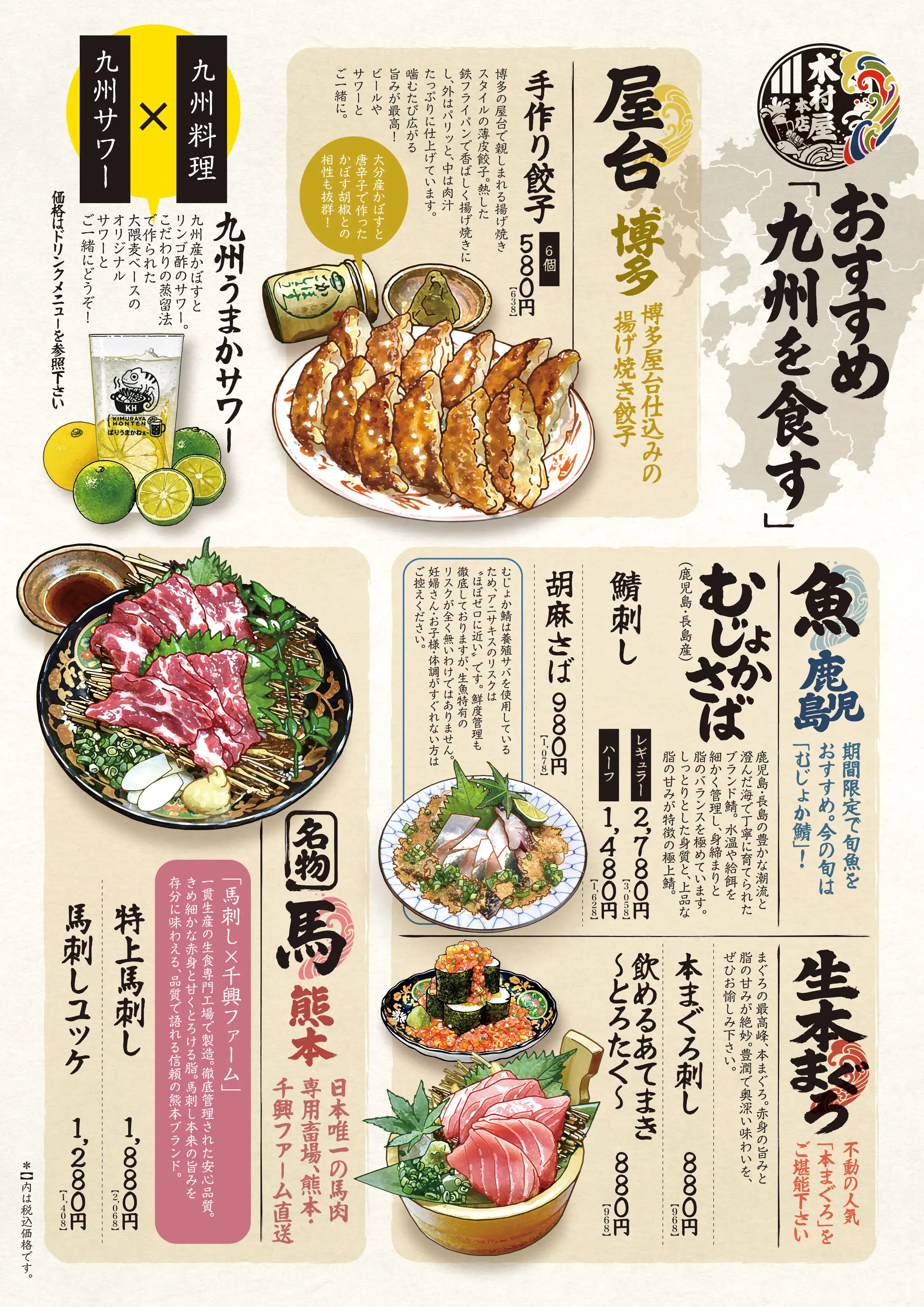 今年で創業20周年の木村屋のもつをはじめ、名物地鶏の炭火焼き、胡麻ぶりなど、九州の旨かもんを一度に楽しめる木村屋本店自慢の宴会コースです、旬の味覚を取り入れた前菜から、〆のちゃんぽん麺まで満足度抜群!歓迎会・送別会・あらゆる宴会にオススメ!※金曜・祝前日は2時間制でのご案内となります。